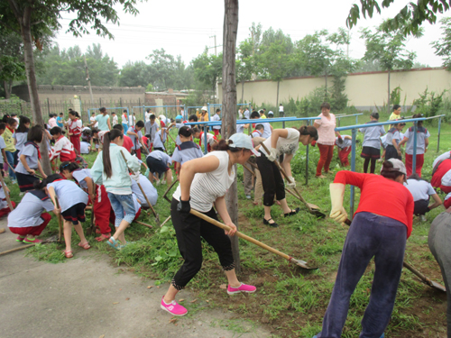 6月30日下午,殷都洹滨小学全体师生进行洁净校园活动,给即将到来的暑假画上干净的一笔。 在校园的绿化带和草场上,师生齐动手,有的拿铲子、有的拿镰刀、有的用手拔草,许多家长也参与到了本次劳动中,整个劳动场地热火朝天。约一小时后,所有的杂草被清理干净,校园内更加整洁靓丽了。本次活动也是一次爱校、卫生实践教育。