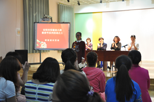 在悠扬的乐曲中,小朋友代表走上舞台,表达了对老师的祝福,拉开了庆祝活动的序幕。大会由三个活动组成:活动一:新教师进行入职宣誓,全体教师签订师德承诺书;活动二:为提升教师文化内涵,园领导为教师赠送幼教专业书籍;活动三:师徒结对活动。十五位省市级骨干教师担任教学师傅,他们将指导、帮助年轻教师尽快地实现角色的转换,快速提高他们的教育教学水平。会上,师傅与徒弟代表上台表达了他们的心声,园领导做了总结性发言,她对年轻教师的快速成长提出了殷切的希望和具体的要求,希望年轻教师虚心学习,扎实工作,尽快提高教育教学水平。