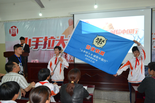 本次活动安排有“小手拉大手 诚信中国行”授旗仪式、信使联盟互动、诚信主题讲座等环节,诚信讲座特聘请安阳市师范学院的郑鹏博士主讲。本次活动安排有序,内容丰富,参加现场活动的100余名家长和学生深受启发,感受颇深。充分认识到一个人只有讲诚信,才能赢得人们的信赖和尊重,诚信是一个人的立身之本。最后参与活动的所有人员在“小手拉大手 诚信中国行”签字墙上签字,为此项活动画上圆满句号。