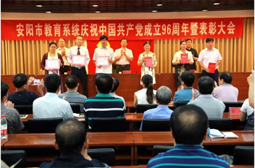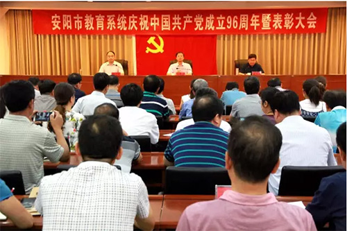 6月29日,市教育局在局二楼会议室召开了安阳市教育系统庆祝中国共产党成立96周年暨表彰大会。市教育局机关党员干部、局直各单位党政主要负责同志、办公室主任和优秀党员代表参加了会议。市教育局党委委员、副局长朱中林同志主持会议。